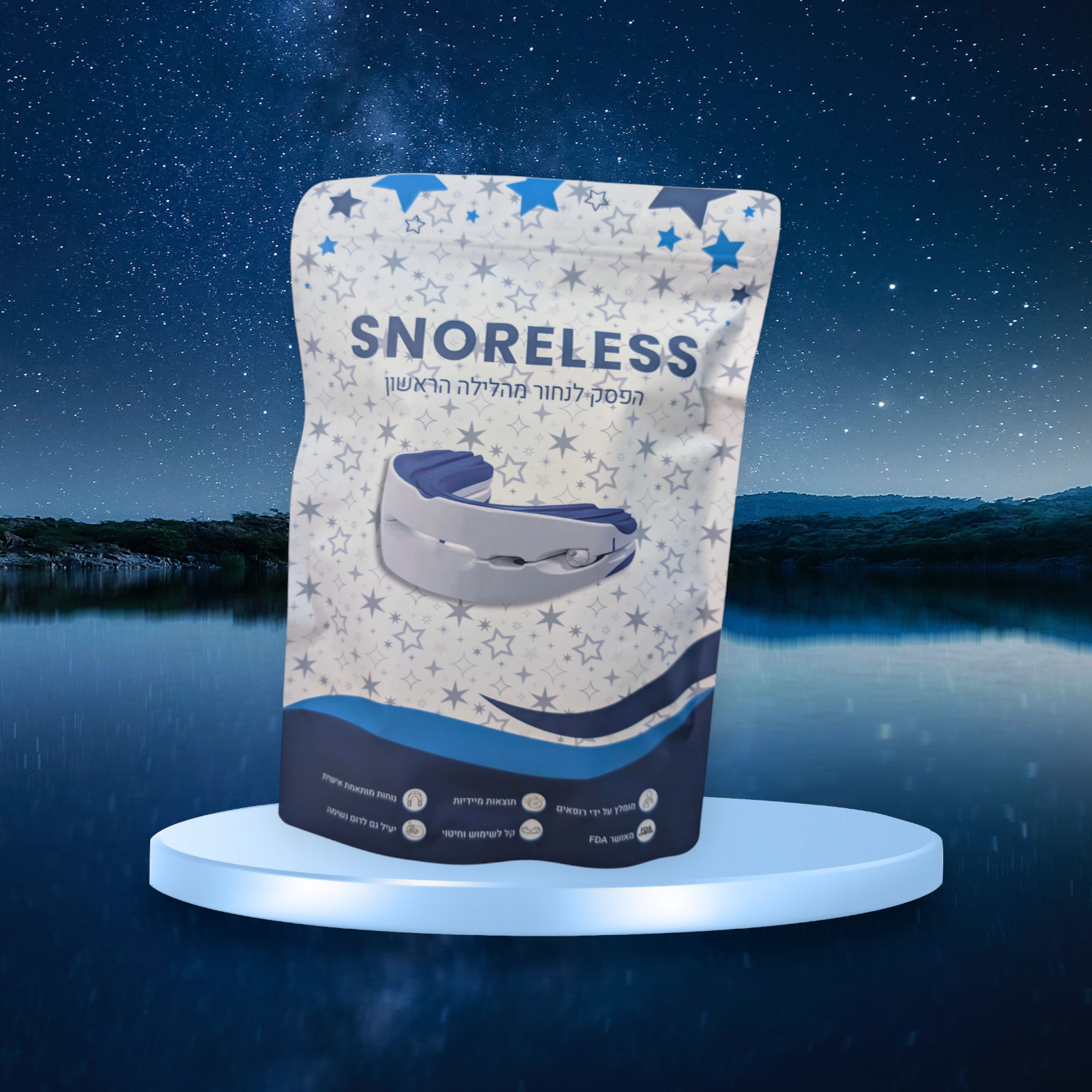 ה-SNORELESS הוא מכשיר נגד נחירות שמתאים את עצמו לכל משתמש. הוא מקדם את הלסת התחתונה קדימה, מה שפותח את קנה הנשימה ומונע נחירות במהלך השינה.
